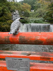 昨日までの蒸し暑さから一気に秋らしい気温になり、三徳山も少しずつ紅葉が始まりました。 小雨が降る中、会員12人が集まり、第2駐車場近くの橋の欄干にある、三朝町の鳥「ヤマセミ」をみんなで鑑賞しながらスタートです。初めて見る方は本物と見間違えてビックリされます。そんな中、最初に現れてくれたのはダイサギでした。県道までの階段を上がり、三徳川を下ります。