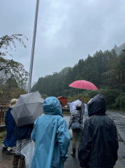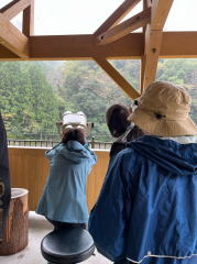 遥拝所に到着し、設置してあるNikonの望遠鏡で投入堂をみんなで見ました。観光客の方も悪天候の中、次々といらっしゃってました。雨宿りも兼ねて、ここでシジュウカラの言葉の研究をされている、鈴木俊貴さんの書籍「僕には鳥の言葉がわかる」に書かれている混群のお話しをしました。これからカラ類の混群が見られる時期なので、鳴き声に耳を傾けながら鳥見をすると、今までと違った発見があるかもしれませんね。