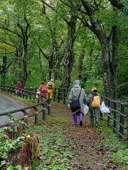 開会式が終わったら、ゴミ拾いに出発します。野鳥の会が担当している場所は例年どおりで、大山寺から環状道路を歩いて横手道入口までです。ゴミを探しながら、野鳥の声を聞きながら、足元の植物の観察もします。足元が悪いので谷筋までは下りず、道路周辺だけのゴミを拾いました。