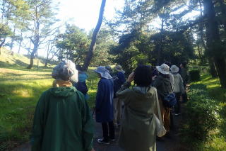 前週の下見では小鳥類の声がもう少し聞こえたのですが、この日はやたらと静かでした。しばらく歩くと、少し先の藪の中から、聞きなれない声がします。近づいて聴いてみるとオオムシクイの声でした。春と秋に通過する旅鳥です。残念ながらこれを聴けたのは少人数でした。