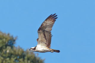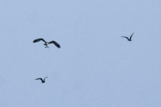 海上には、これまた遠くにカンムリカイツブリとさらに遠くに結局何かわからなかった集団が浮かんでいます。判らないね~などと言いつつ進んでいくと、餌持ちのミサゴが魚の横取りを狙う輩(種は不明)を振り切って南へ飛んでいく様子が見られました