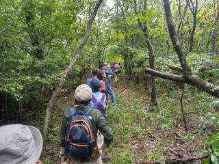 気を取り直して出発。滑らないよう足元に注意を払い、ひたすら前進。林の中は雨で湿っていて、至る所にキノコが顔を出していた。中には団子が二つ重なった様な面白いキノコが沢山生えていて、焼いて食べれば旨いだろうなと思ったが、「ここに生えているほとんどのキノコは食用にはならない」と参加者からの一言。これがシメジやマイタケだったらと少し残念な気もした。