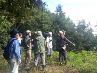 出発前にもう一度注意喚起。「山道は赤土なので良く滑る転ばない様に」と一言発して出発。宅地を抜けて雑木林に分け入った、下草は刈ってあり、歩きやすくなっていたがヌカルんでいた。急勾配の坂道を上りきった所で休憩。耳を済ませてみたが、ヒヨドリの鳴き声とツクツクボオシの声だけで他の鳴き声はしなかった。