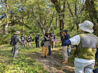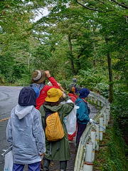 遥拝所に到着し、設置してあるNikonの望遠鏡で投入堂をみんなで見ました。観光客の方も悪天候の中、次々といらっしゃってました。雨宿りも兼ねて、ここでシジュウカラの言葉の研究をされている、鈴木俊貴さんの書籍「僕には鳥の言葉がわかる」に書かれている混群のお話しをしました。これからカラ類の混群が見られる時期なので、鳴き声に耳を傾けながら鳥見をすると、今までと違った発見があるかもしれませんね。