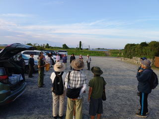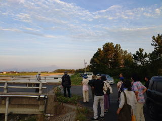 米子水鳥公園入口の駐車場には、会員8人と会員でない人(家族連れ)が12人、合計20人が集まりました。観察場所近くの駐車スペースが確保できる場所まで車で移動し、全員が説明を聞きながら、おしゃべりをしながらツバメの到着を待ちました。夕暮れになると気温が下がり、心地よい風が吹きます。暫く待つと、スズメの小群、ムクドリの中群、カワウ、キジバト、サギ類がねぐらを求めて飛んで行きます。