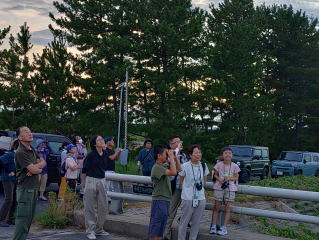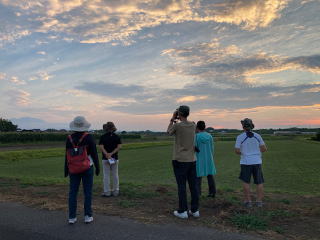 今年の夏は暑いです。昼間には探鳥会はできませんね。というわけで・・・はないですが、この時期の風物詩「ツバメのねぐら入り」の観察会を行いました。この探鳥会は事前のねぐら探しから始まります。幸い、昨年とほぼ同じ場所がねぐらにしているようでした。でも油断はできません。探鳥会直前にねぐらを移動して、その場所が分からなくて中止した年もありました。今年は大丈夫でした。