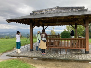 ところがです。始まるころには霧が晴れ、雨は小降りに、カミナリの音も聞こえなくなりました。と同時に参加者も2組(1組は初参加)ありました。いずれも高校生の娘と母親。誘い合っての参加でした。駐車場近くの東屋に腰を落ち着け、野鳥を探します。