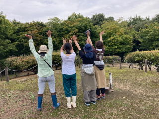 広場の東屋で野鳥を探します。 一等三角点(標高177.14m)に登頂し、全員でバンザーイ