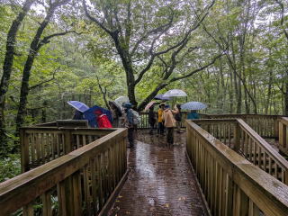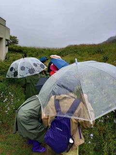 雨の中、ウメバチソウを観察しました 自然学習歩道の展望デッキへ