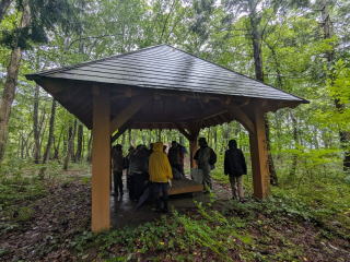 雨足が強い時にはアンダーパスや東屋で雨宿りをし、野鳥や山野草の名前のしりとり、水浴び・砂浴びなど野鳥生態ミニ講話やマダニ感染の注意喚起の話題もありました。少しだけ明るくなってくるとヒガラ、コゲラなどの声が聞こえましたが、姿をじっくり見るということはできませんでした。