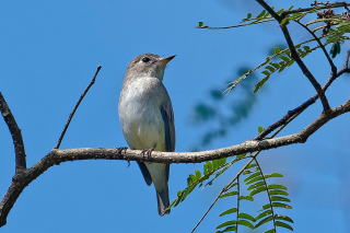そのほか、ヤマガラやメジロの声はするのですが、たまに姿を認めても、茂った葉の中をこまめに動き回るので、「○○〇がいます」と説明はしても、なかなか皆さんに観ていただけません。そんな中、よく実ったミズキの木から飛び立った小鳥が、近くの枝にとまりました。コサメビタキでした。ありがたいことに2分くらいにわたりじっと止まってくれていたので、スコープでかわるがわる観察いただけました。
