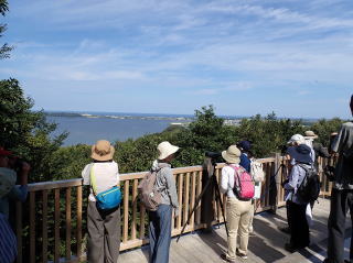 この日は2つの谷筋をコースにしたのですが、最初のコースに見切りをつけて、下見の際に比較的にぎやかだったもう一方のコースを目指します。ここではエゴノキを訪れるヤマガラの姿やミズキに集まるエゾビタキが期待できます。ところが、本番では本当に静かで、声すらまばらで、予定コース末端の展望台から湖山池が見下ろせたのがせめてもの救いでした。スコープでアオサギやカワウが認められ、はるかに遠い鳥の姿が拡大して観察できたことに驚く声もきかれて好評でした。ですが、さすがにこれは範囲外なので湖山池の鳥は記録に入れませんでした。そのあと、出発地に戻る途中でエゾビタキを認めてスコープに入れたのですが、観察できたのは3名だけでした。