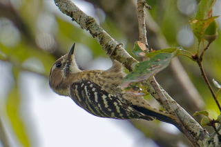 キョロキョロと周りを見回しながら進んでいると、やっとコゲラが姿を見せたが、動きが素早く慣れないメンバーは見えたかどうか? 目的の休憩地点に近づいた時、今度はエナガに遭遇。尾根の縦走が終わりしっかり休憩を取った後、いよいよ最後の下り坂に入った。中程まで下った時に「キョキョッ」とキツツキの声が近くで聞こえ、皆で一斉にその方行を探し、しばらく姿を現すのをまったが駄目だった。