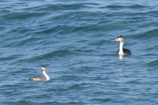 ④。最後にはカンムリカイツブリが近くまで移動してきてくれて、ゆっくりと観察しました ⑤。
