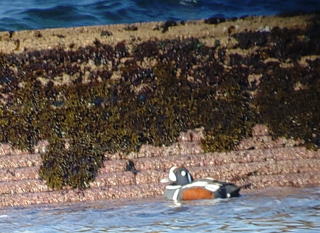 その後、車に分乗して海岸沿いに東へ移動し、まず淀江港でお目当てのシノリガモを見つけました。彼らのユニークな白・ブルーグレー・レンガ色の模様が順光に美しく映えていました。