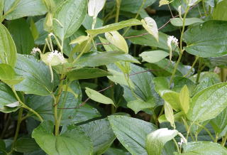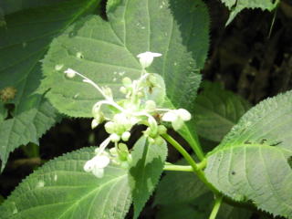 その後は、自然と足元の植物に関心が移り、咲いていたイワタバコの花や、もう少しで咲きそうなウバユリ多数などを見つけて参加者に見て貰った。葉の真ん中に実の付いているハナイカダも見つけた。ほかに、ギンバイソウ(白い花)の群落や花は終わっているが二リンソウの群落も有った。駐車場の近くまで戻った時、セミの鳴き声の合間にヒィーー、ヒィーーと微かに数回の鳴声が聞こえて何だろうと相談、結果はトラツグミではないかということになった。途中、キツツキのキョッ、キョッというのも時折聞こえていた。