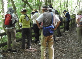 探鳥コースは、集合場所の駐車場からダム湖の北側を通ってハンゲショウの群落地までの往復です。探鳥を始めると、下見の時とは一変して森の中は静かで時折鳴声が聞こえる程度でしたが、徐々に鳴声が聞こえだし、キビタキやサンコウチョウの声も聞くことができました。