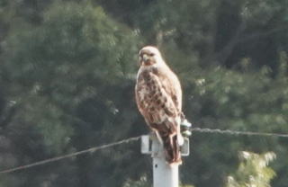 野ネズミ完食後のノスリ、電柱の上で休憩中。 対岸の木に停まったカワセミ♂をウォッチング。