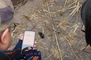 次にマガンとの出会いを求めて論田に移動すると、期待通り、遠くの田んぼにいたマガンが三々五々飛び立って鳴き交わしながら私たちの頭上を移動していきました。マガンの群れの中にはヒシクイも混じっていたようです。 遠くの樹上にはホシムクドリやノスリ、田んぼにはタゲリも見つけることができ、冬鳥の常連たちのオンパレードでした。集合場所に戻って鳥合わせをすると、水辺の鳥・山野の鳥合わせて40種類も確認していました。