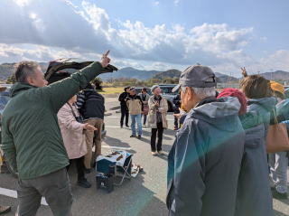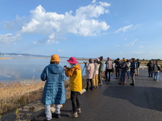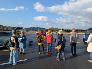 この時期の山陰には珍しく、風もなく時折陽も射す絶好の探鳥日和。安来干拓地にある「中海ふれあい公園」の駐車場に23人(会員外:3人)が集合しました。最初にリーダーが最近米子市内で高病原性鳥インフルエンザが発生したことについて触れ、探鳥する際の注意事項を共有した後、車8台に分乗して飯梨川に向かいました。