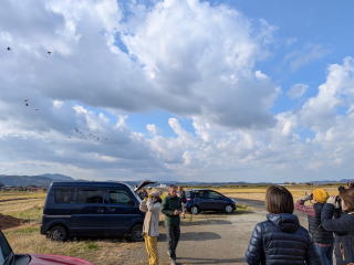 次にマガンとの出会いを求めて論田に移動すると、期待通り、遠くの田んぼにいたマガンが三々五々飛び立って鳴き交わしながら私たちの頭上を移動していきました。マガンの群れの中にはヒシクイも混じっていたようです。 遠くの樹上にはホシムクドリやノスリ、田んぼにはタゲリも見つけることができ、冬鳥の常連たちのオンパレードでした。集合場所に戻って鳥合わせをすると、水辺の鳥・山野の鳥合わせて40種類も確認していました。
