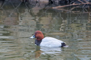 カルガモの群れの中にオカヨシガモが混じる ホシハジロ♂がのんびりと泳いでいました
