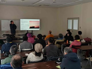 続いて、橋のたもとにある湖山池情報プラザの会議室をお借りして、当支部初開催の「野鳥の鳴き声講習会」を開催しました。これは昨年九月の東部の出会いの森での探鳥会で、時期的に野鳥が少ないことから、BW後に当日の担当のAY氏が自分で採集された野鳥の鳴き声と写真を使って「鳴き声紹介」を実施。好評を得たので、一月の合同探鳥会でもやりましょうということになったものです。