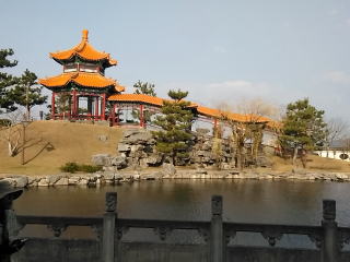 中国庭園の燕趙園が無料期間でしたので入園する事にしました。建物の屋根の真ん中にイソヒヨドリが現れました。私達がいる間、全く動きません。お気に入りの場所なんでしょうね。