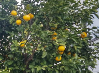 民家の裏庭には美味しそうな夏ミカン 賀露南大橋の上から湖山川の上流方向を観察